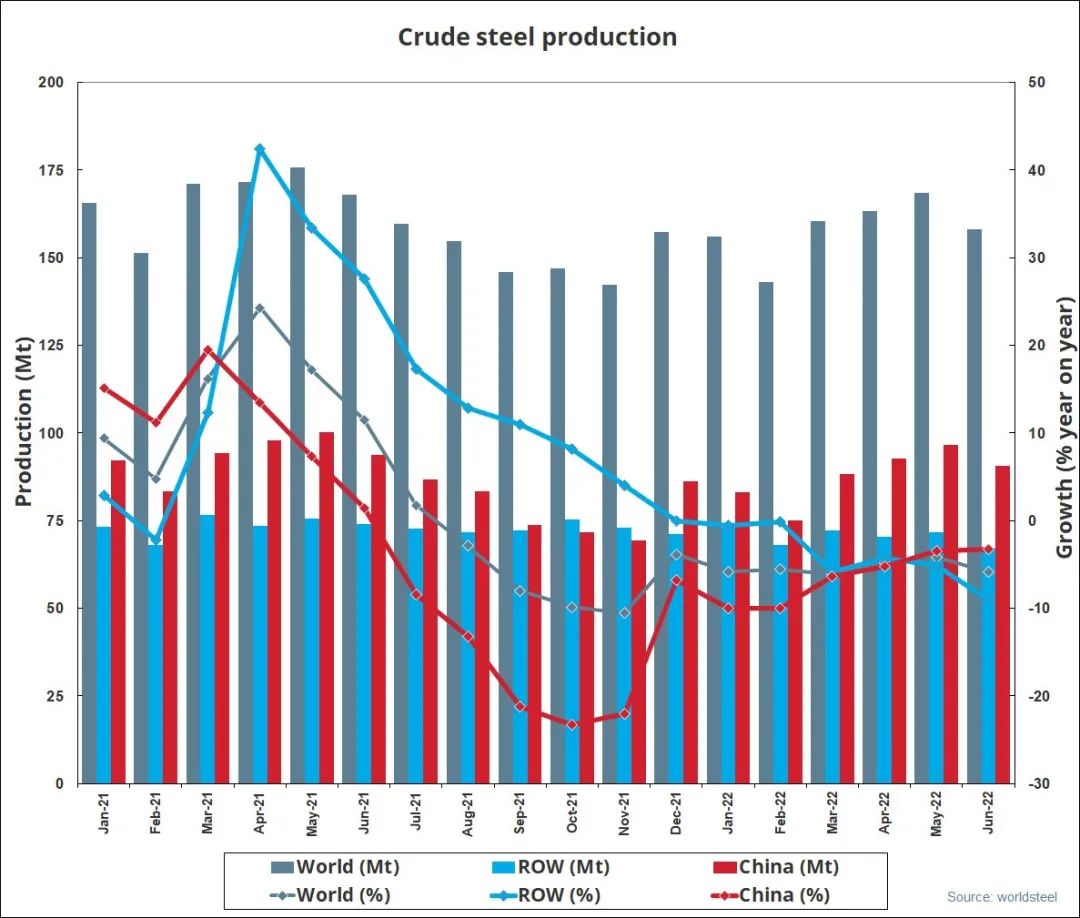 中国铁合金网:2022年6月全球64个纳入世界钢铁协会统计国家的粗钢产量为1.581亿吨,同比下降5.9%。