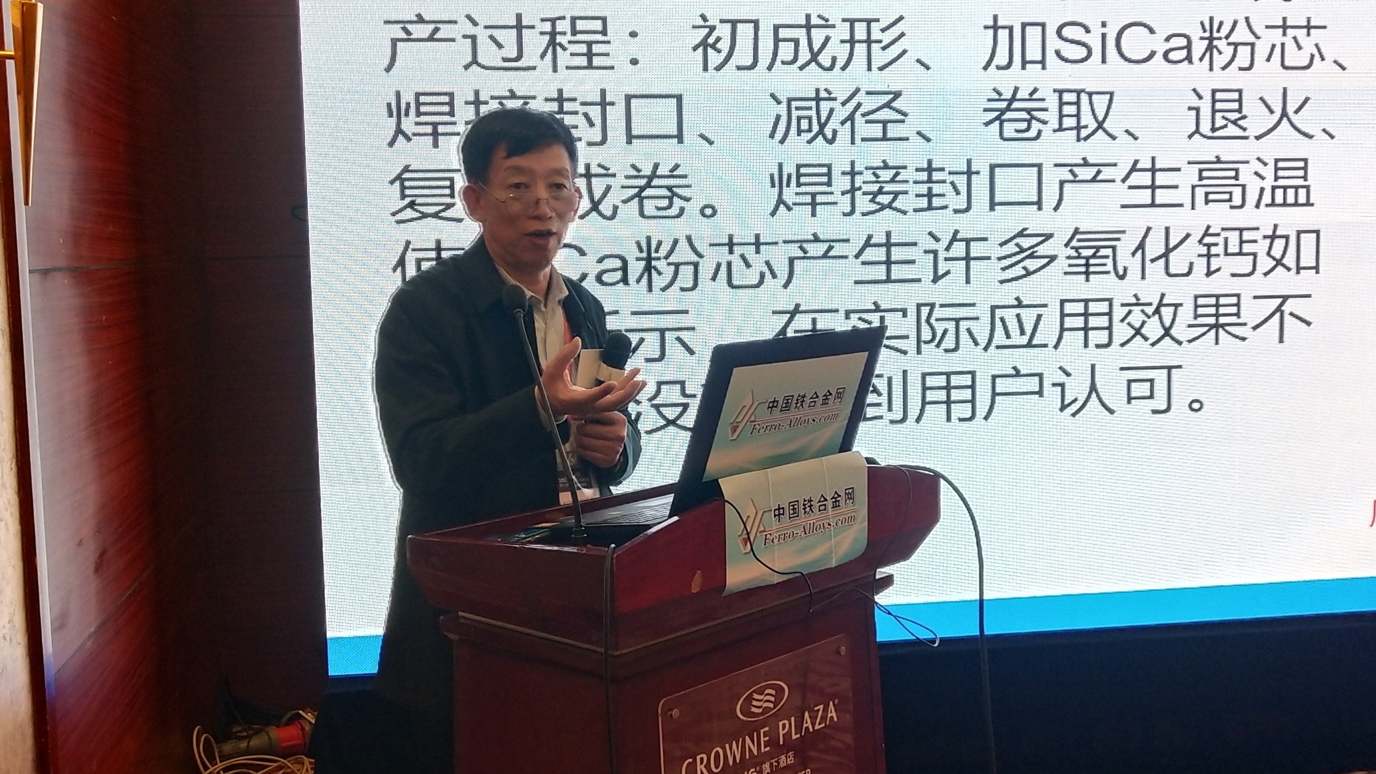 中国铁合金网分析师田亚伟现场汇报《金属钙/硅钙生产现状和金属钙丝市场展望》。金属钙是优质钢、合金钢理想的用于冶金工业的炉外精炼脱氧、脱碳、脱硫剂生产,增加钢水的流动性,也是制取高纯稀土金属的还原剂。金属钙丝在炼钢和铸铁中起到脱氧、脱硫、脱气作用,在铬、铌、钐、钍、钛、铀和钒等金属的生产中起到脱氧的作用,在生产高纯钢和有色合金中作为脱氧剂使用。硅钙合金用于生产洁净钢,以及氧、硫含量特低的特殊性能钢。