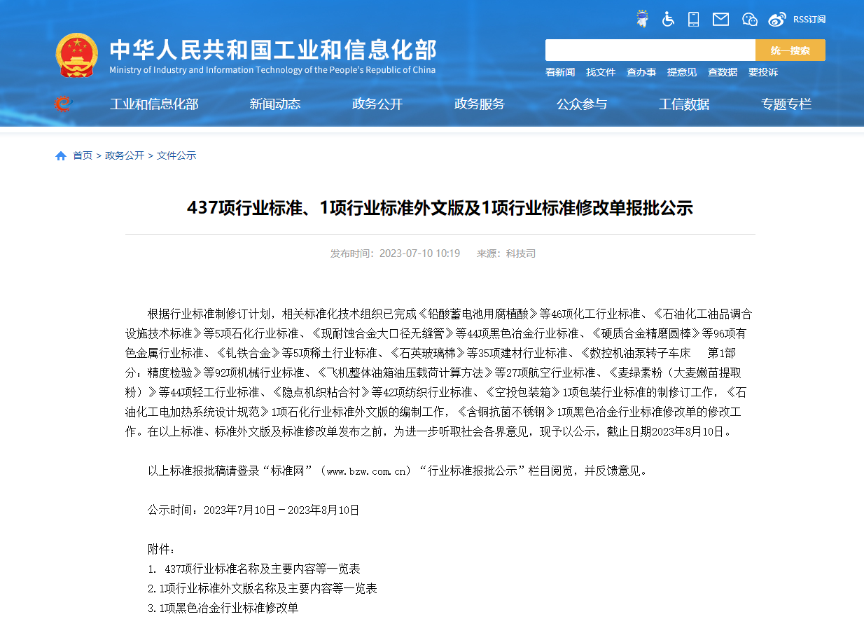 中国铁合金网:根据行业标准制修订计划,相关标准化技术组织已完成《铅酸蓄电池用腐植酸》等46项化工行业标准、《石油化工油品调合设施技术标准》等5项石化行业标准、《现耐蚀合金大口径无缝管》等44项黑色冶金行业标准、《硬质合金精磨圆棒》等96项有色金属行业标准、《钆铁合金》等5项稀土行业标准、《石英玻璃棉》等35项建材行业标准、《数控机油泵转子车床 第1部分:精度检验》等92项机械行业标准、《飞机整体油箱油压载荷计算方法》等27项航空行业标准、《麦绿素粉(大麦嫩苗提取粉)》等44项轻工行业标准、《隐点机织粘合衬》等42项纺织行业标准、《空投包装箱》1项包装行业标准的制修订工作,《石油化工电加热系统设计规范》1项石化行业标准外文版的编制工作,《含铜抗菌不锈钢》1项黑色冶金行业标准修改单的修改工作。在以上标准、标准外文版及标准修改单发布之前,为进一步听取社会各界意见,现予以公示,截止日期2023年8月10日。