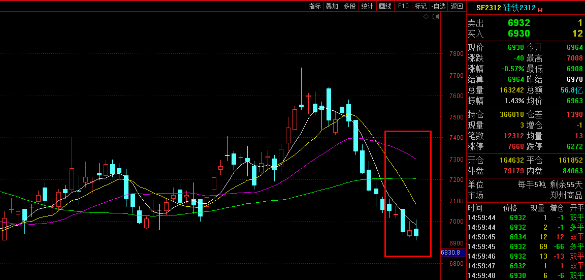 期货端:硅铁期货盘面继续下行,2312主力合约周开盘价7,084,最高价7,104,最低价6,908,收盘价6,930,结算价6,964,成交量812,295,持仓量366,010,跌幅2.12%。
