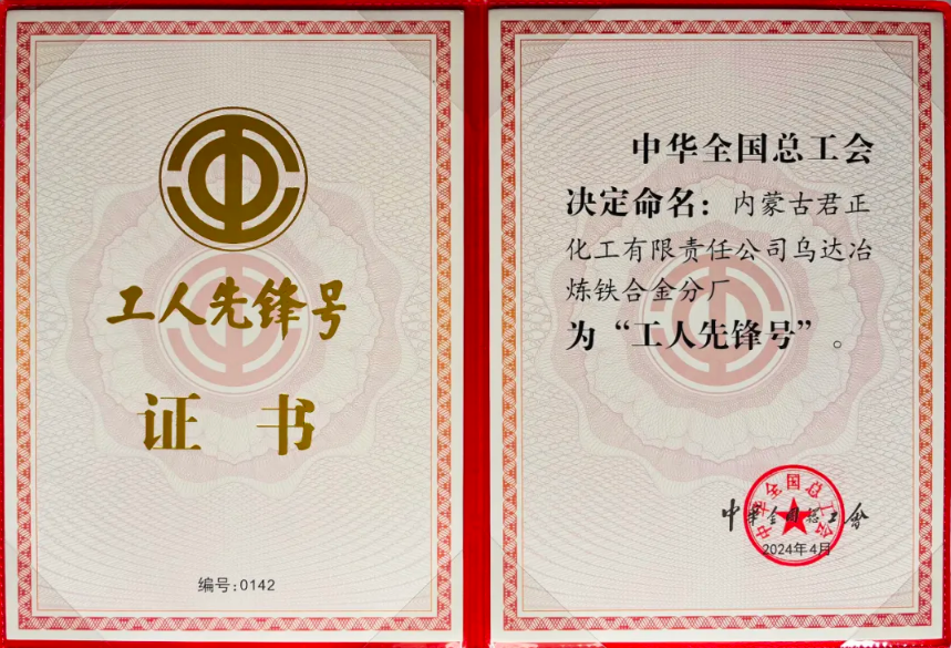 中国铁合金网:4月28日,庆祝“五一”国际劳动节暨全国五一劳动奖和全国工人先锋号表彰大会在北京人民大会堂召开,内蒙古君正化工有限责任公司乌达冶炼铁合金分厂荣获“全国工人先锋号”。
