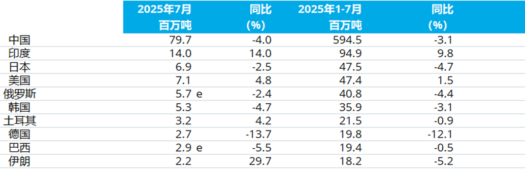 中国铁合金网:2025年7月全球70个纳入世界钢铁协会统计国家/地区的粗钢产量为1.501亿吨,同比下降1.3%。