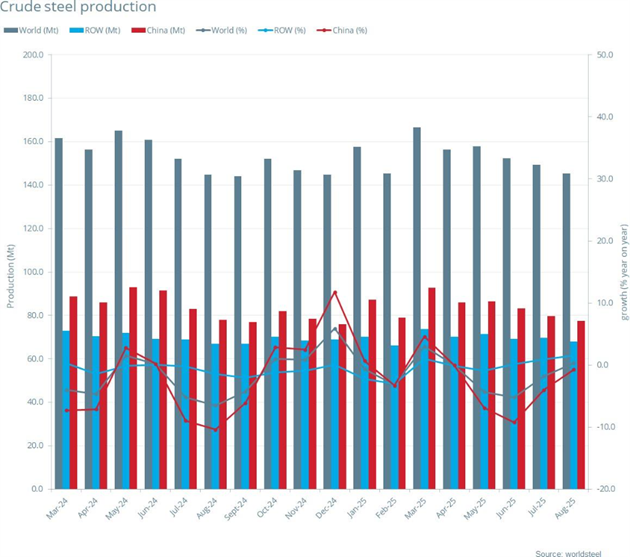 中国铁合金网:2025年8月全球70个纳入世界钢铁协会统计国家/地区的粗钢产量为1.453亿吨,同比提高0.3%。