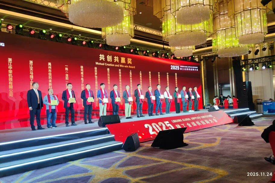 2025年11月24日,以“智慧·绿色·延伸人类力量”为主题的柳工全球供应商大会在柳州隆重举行,大会汇聚了600余名全球供应商伙伴。恒利来凭借卓越的产品品质与深入的技术服务,荣获柳工授予的“共创共赢奖”。