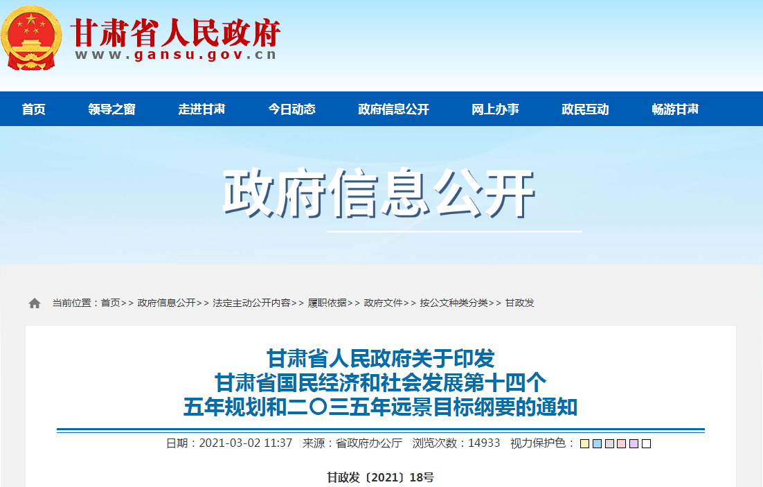 甘肃省人民政府关于印发甘肃省国民经济和社会发展第十四个五年规划和二〇三五年远景目标纲要的通知