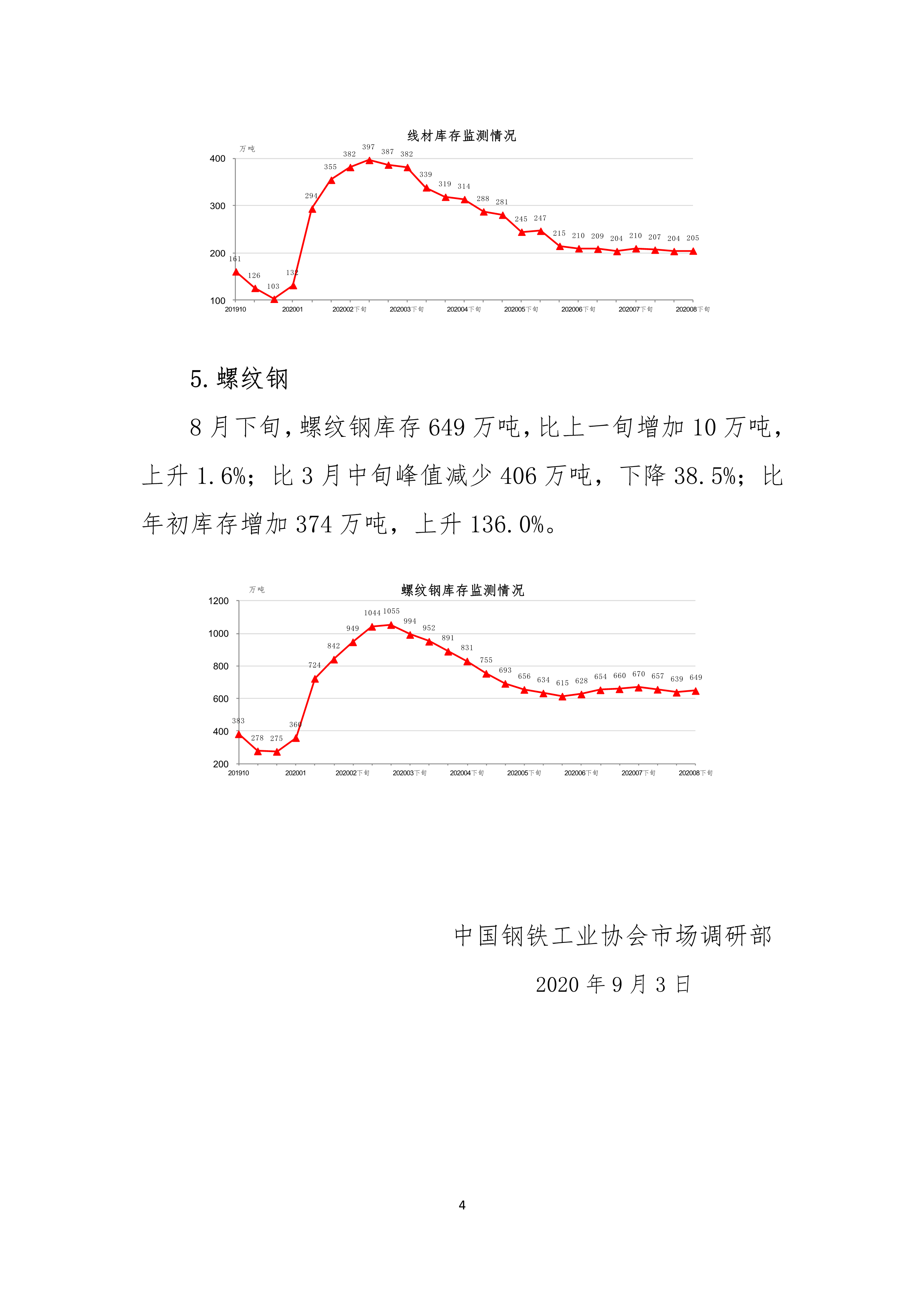 2020年8月下旬,重点统计钢铁企业共生产粗钢2376.22万吨、生铁2118.52万吨、钢材2412.99万吨、焦炭357.01万吨。本旬平均日产,粗钢216.02万吨,环比减少0.04%、同比增长7.16%;生铁192.59万吨,环比增长1.03%、同比增长6.20%;钢材219.36万吨,环比增长6.08%、同比增长10.04%。 |