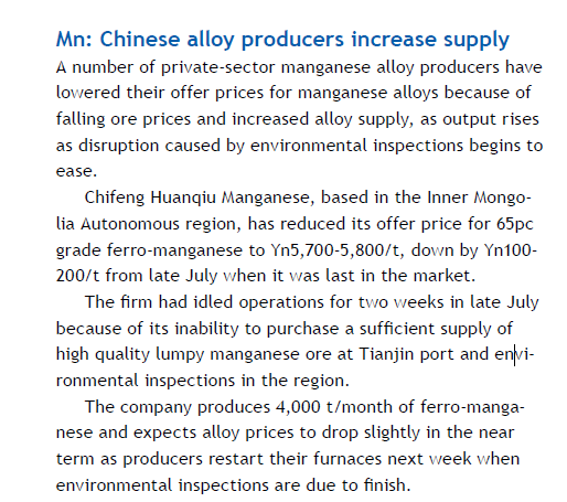 中国铁合金网讯:由于锰矿价格降低和锰合金产品的市场供应量增加,许多锰合金厂家降低了合金产品的报价。 内蒙古赤峰市环球锰业有限公司65#高锰报价为5700-5800元/吨,比7月底的价格下调了100-200元/吨。 赤峰环球公司在7月底停产了两个星期,原因是这家公布不能在天津港采购到... |