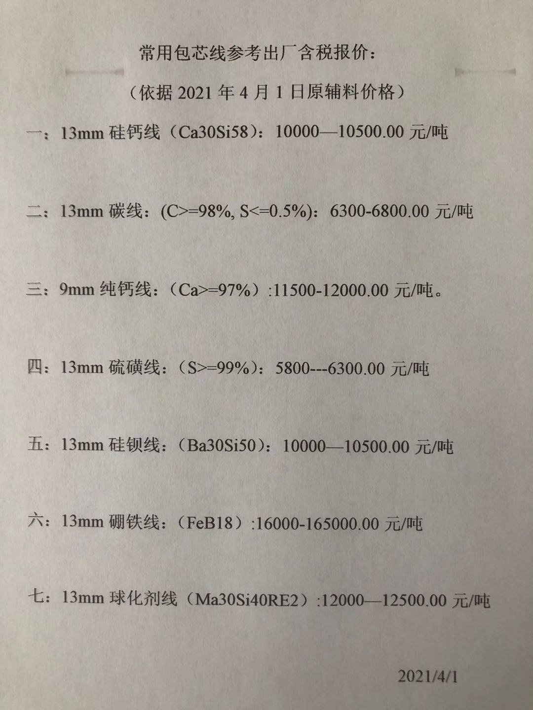 | 带钢价格持续上涨,金属钙生产厂家受原料价格上涨影响,目前呈惜售状态暂不对外报价,看涨氛围浓厚,包芯线价格均上调100-150元/吨。 |