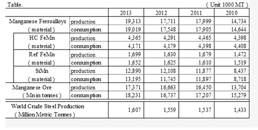 中国铁合金网讯:据国外有关媒体报道,2013年全球锰产品产量为1901.9万吨,较上一年度1754.8万吨上涨了8.4%。同时,锰产品消耗量为1931.3万吨,较去年同的1771.1万吨增加了9.0%。而2013年度锰产品产量及消耗量的增加主要得益于粗钢产量的增加。 |