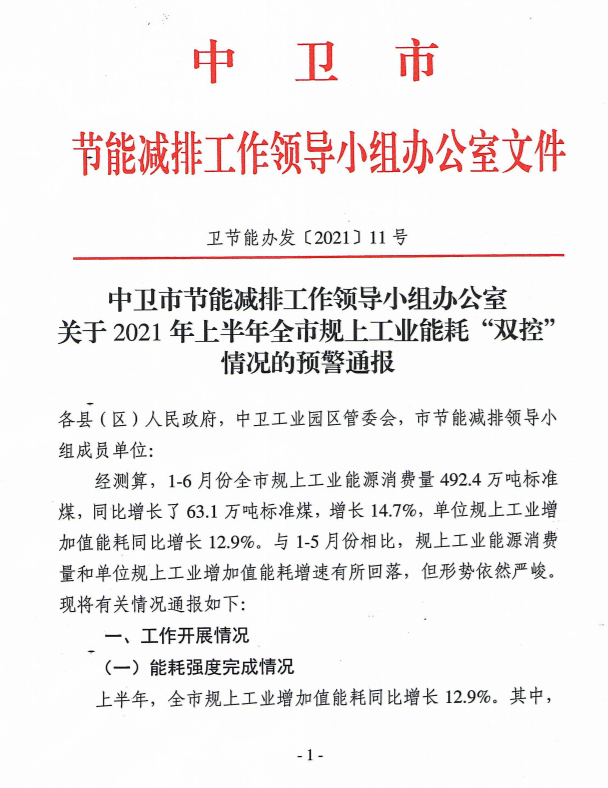 中卫市关于印发《关于进一步提高高耗能行业能耗水平确保完成能耗“双控”目标任务的实施方案》的通知。 |