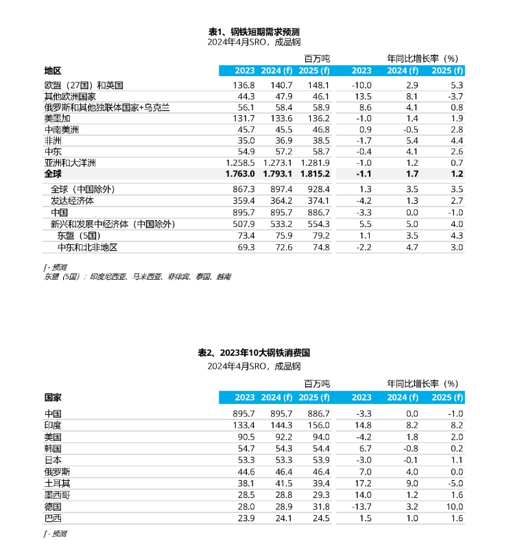 世界钢铁协会发布2024年4月版短期钢铁需求预测报告