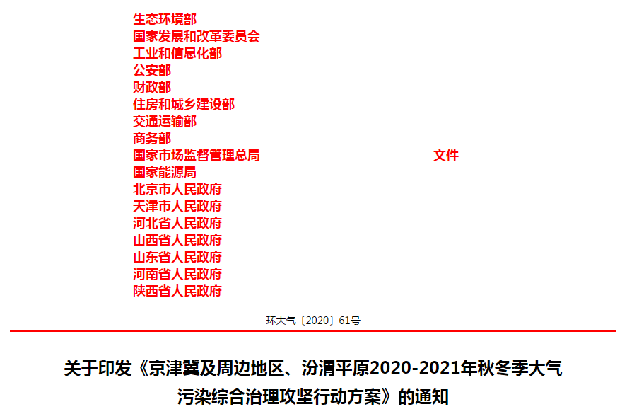 关于印发《京津冀及周边地区、汾渭平原2020-2021年秋冬季大气污染综合治理攻坚行动方案》的通知。 |