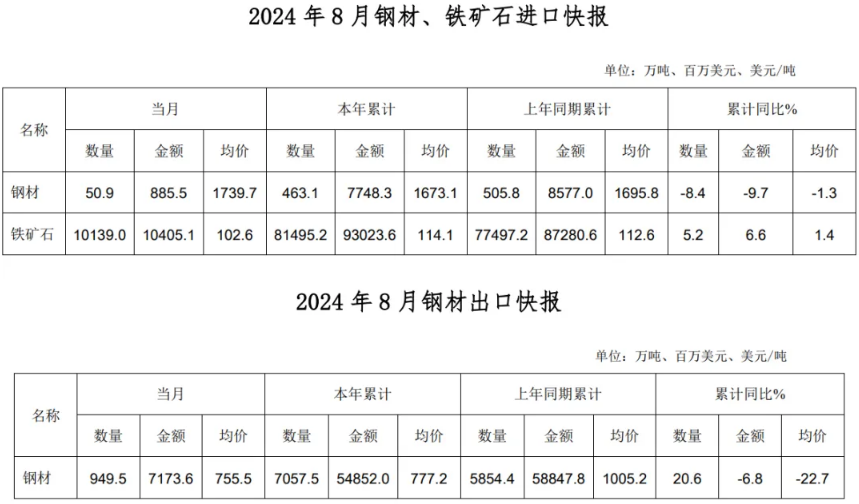 2024年8月主要冶金产品进出口快报