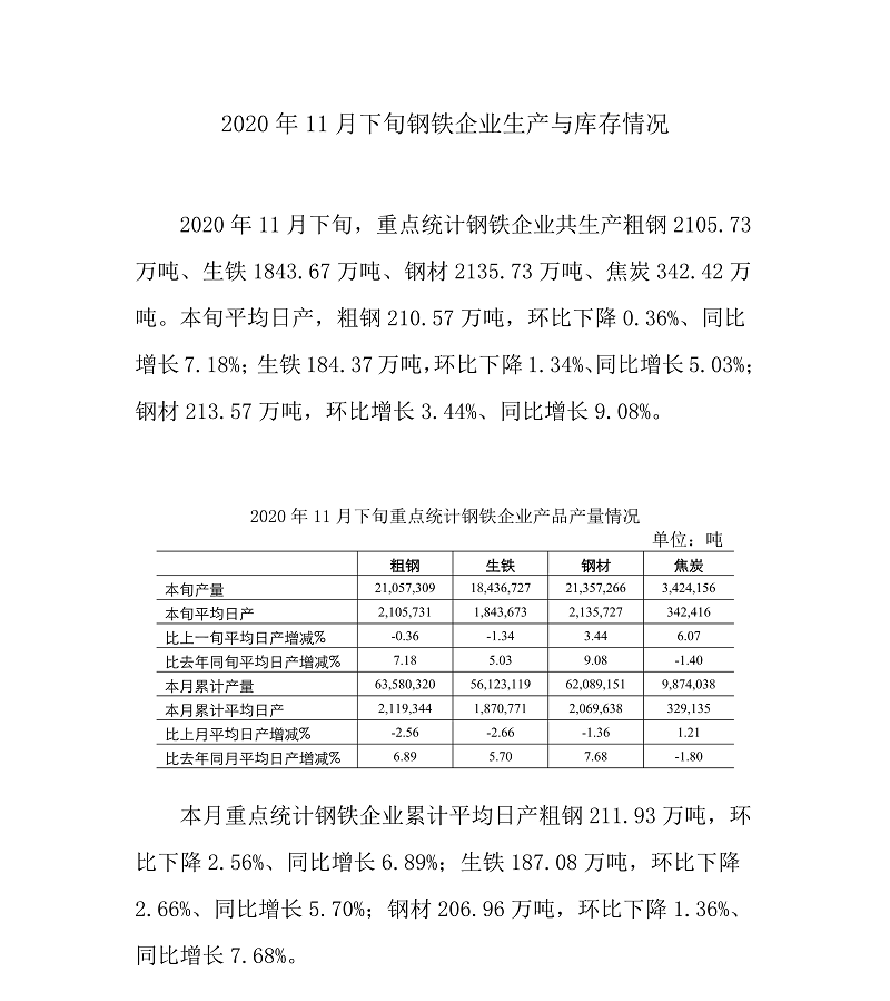 2020年11月中旬,重点统计企业共生产粗钢2113.4万吨,日产粗钢211.34万吨,环比下降1.53%,同比增长5.87%。 |