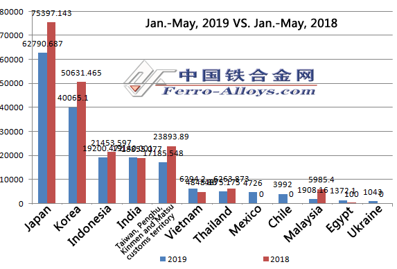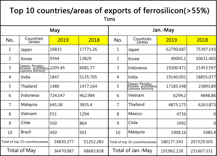 There were 26377 tons of ferrosilicon(>55%) were exported to Japan and Korea, about 72.3% of the total exports of May, 2019.