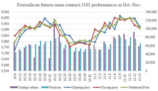 [Ferrosilicon Futures 2101 Contract] Opening price of ferrosilicon futures 2101 contract of this week was 6,020, highest price was 6,040, lowest price was 5,888, closing price was 5,916 and the settlement price was 5,912. The trading volumes were 386,836 and the positions were 65,990.