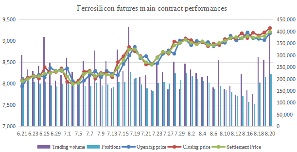 Opening price of ferrosilicon futures 2201 contract of this week was 9,098, highest price was 9,306, lowest price was 8,858, closing price was 9,300 and the settlement price was 9,216. The trading volumes were 1,260,948 and the positions were 220,947
