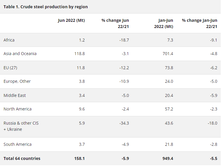 【Ferro-alloys.com】:World crude steel production for the 64 countries reporting to the World Steel Association (worldsteel) was 158.1 million tonnes (Mt) in June 2022, a 5.9% decrease compared to June 2021.