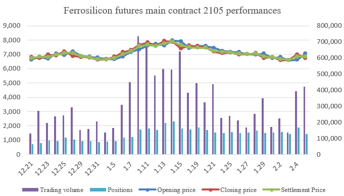 The 2105 ferrosilicon contract price on ZCE closed at 7000 yuan per ton on February 4. |