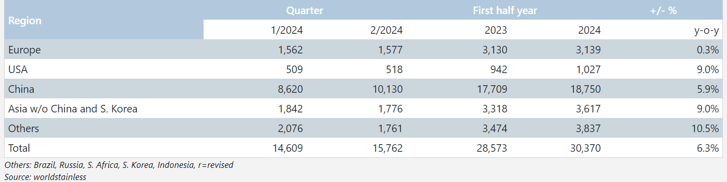 Stainless Steel Melt Shop Production increases by 6.3% y-o-y to 30.4 million metric tons in the first 6 months of 2024
