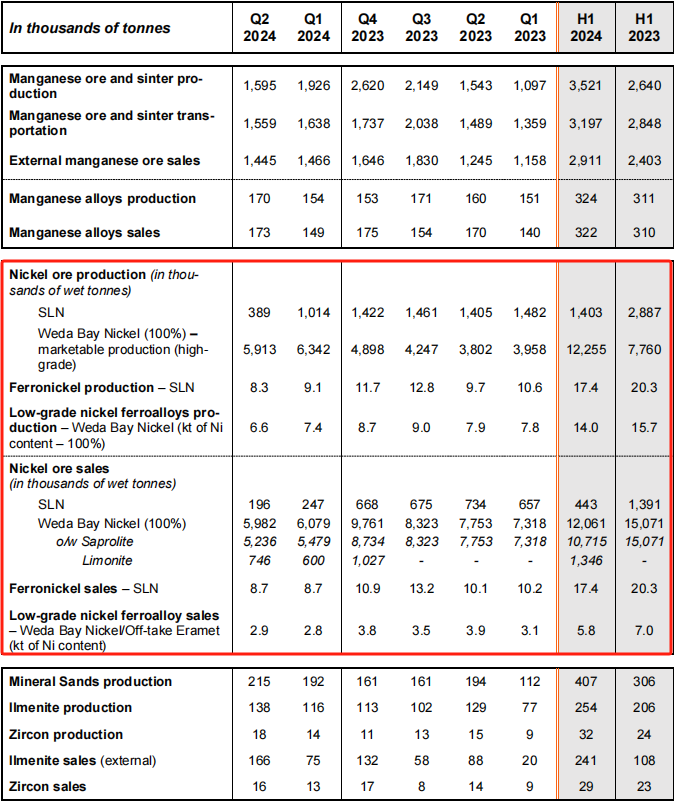 Vale’s Q2 nickel production totaled 27.9 kt, 24% lower y/y, mainly reflecting the planned maintenance strategy at the nickel processing plants. |