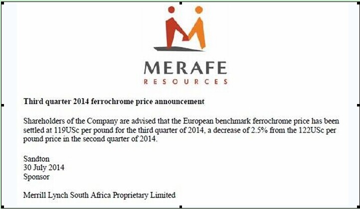 中国铁合金网讯:2014年7月30日,梅拉菲资源宣布欧洲三季度铬铁基准价敲定。