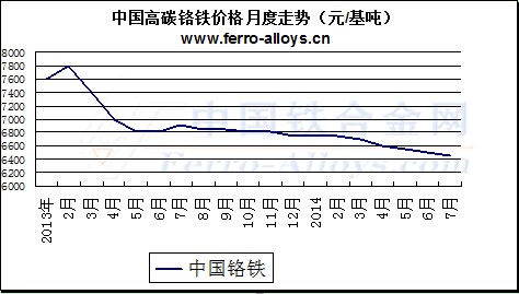 中国铁合金网讯:由下图可以看出,近两年中国铬铁价格一直呈下跌趋势,2013年上半年跌势比较明显,累计跌幅达800元;2013年下半年至2014年8月份,铬铁跌势虽然逐步放缓,但是并一直没有停止,钢厂基本上以每月下调50-100元/基吨的步伐来试探和挑战铬铁生产底线。2014年8月,太钢高碳铬铁招标价降至6250元/基吨(到厂含税现款价),较去年同期的6750元/基吨下降了500元/基吨。