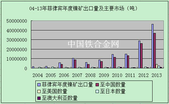 由上图可以看出,2004-2008年的五年间,菲律宾镍矿出口量整体偏低,而2009年开始稳步增长,2013年菲律宾镍矿出口总量已高达4620万吨,和09年的871万吨相比增长了430%,涨幅惊人。