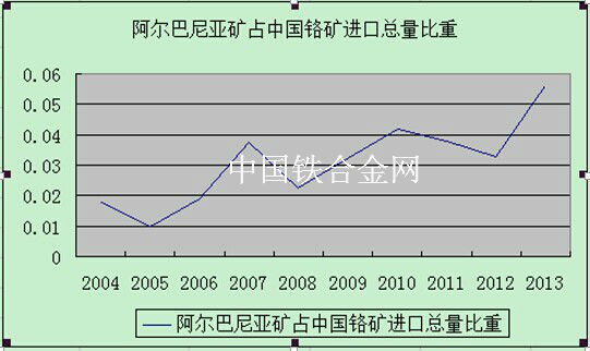 图1. 2004-2013年阿尔巴尼亚矿占中国铬矿进口量比重: