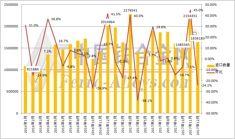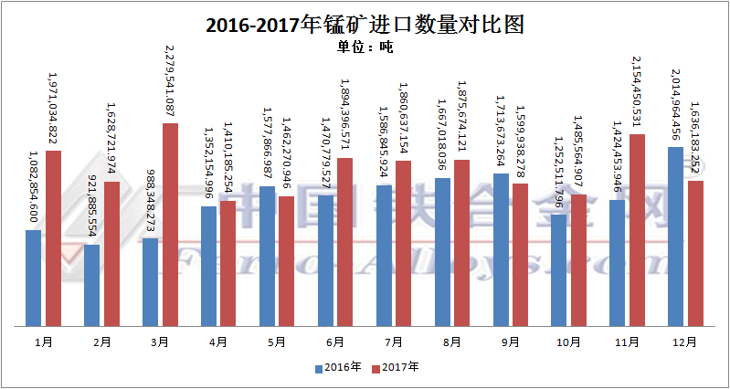 中国铁合金网讯:2016年-2017年全国锰矿每月进口数量统计分析