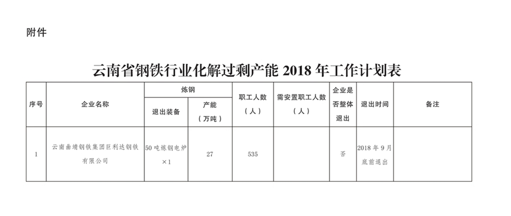 附件:云南省钢铁行业化解过剩产能2018年工作计划表
