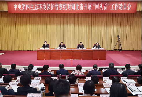 为深入贯彻落实习近平生态文明思想,经党中央、国务院批准,中央第四生态环境保护督察组近日进驻湖北省开展环境保护督察“回头看”。10月30日,中央第四生态环境保护督察组对湖北省开展“回头看”工作动员会在武汉召开,督察组组长李家祥、副组长赵英民就做好督察“回头看”工作分别作了讲话,湖北省委书记蒋超良作了动员讲话,会议由湖北省长王晓东主持。