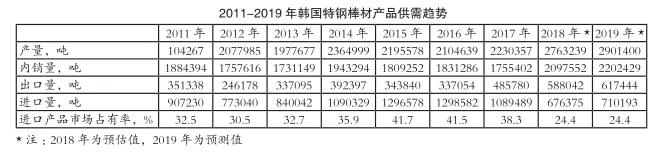 【中国铁合金网讯】韩国钢铁协会近期发布报告显示,预计2019年韩国碳钢、合金钢、工具钢和不锈钢等特钢棒材的供需总量将同比增加5%。预计2019年特钢棒材的总产量为2901400吨,其中内销量为2202429吨,出口量为617444吨,进口量为710193吨。