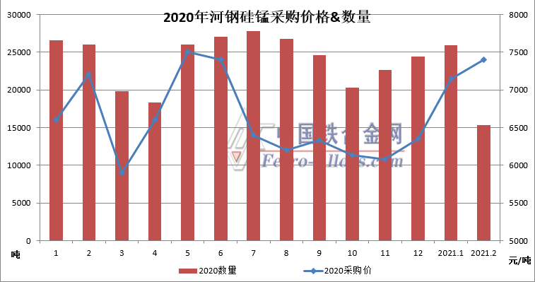 河钢集团公布12月硅锰二轮询盘价6280元/吨,一轮询盘6230元/吨(11月定价6080元/吨、2019年12月定价5950元/吨)。采量24400吨,环比11月增加1800吨(2019年12月采量24000吨)。具体采购价量价关系如下: