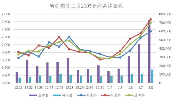 【期货行情】本周硅铁期货2105主力合约表现强劲,周三尾盘涨停,周四高开高走,周五再度涨停。周开盘6,670,最高价7,664,最低价6,572,收盘价7,664,结算价7,576,成交量1,799,200,持仓量154,420,涨幅15.18%。