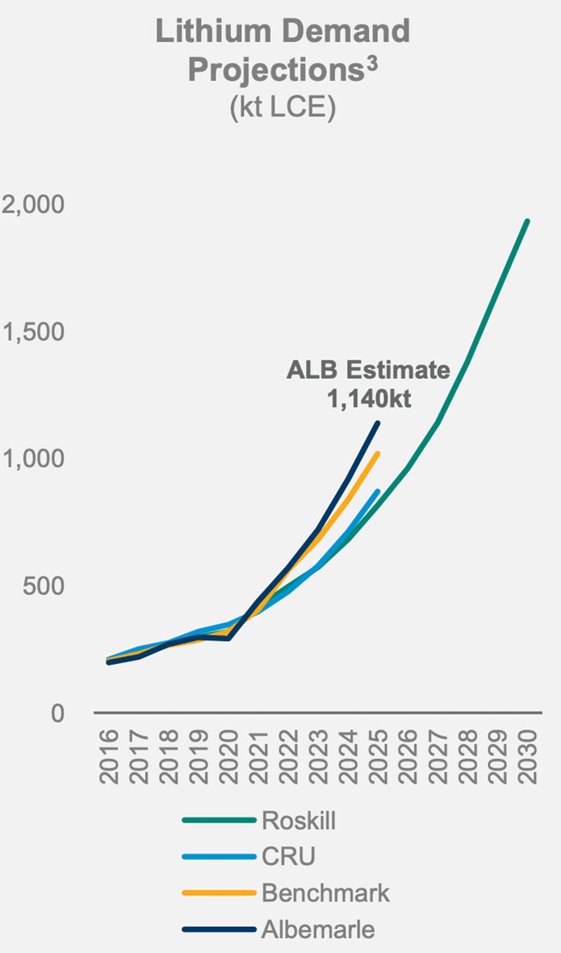 尤其是锂价格的早期回升,让许多人大吃一惊。主要生产商Albemarle估计需求量将突破众所周知的极限: