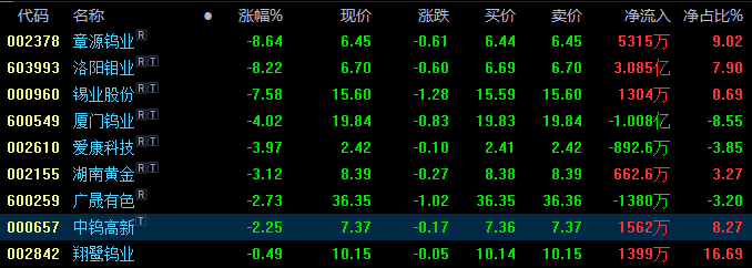 截止本周五,钨上市公司收盘表现全部下跌,具体为:章源钨业跌近9%,洛阳钼业跌超8%,锡业股份跌近8%,厦门钨业跌超4%,爱康科技跌近4%,湖南黄金跌超3%,广晟有色跌近3%,中钨高新跌超2%,翔鹭钨业跌幅不足1%。