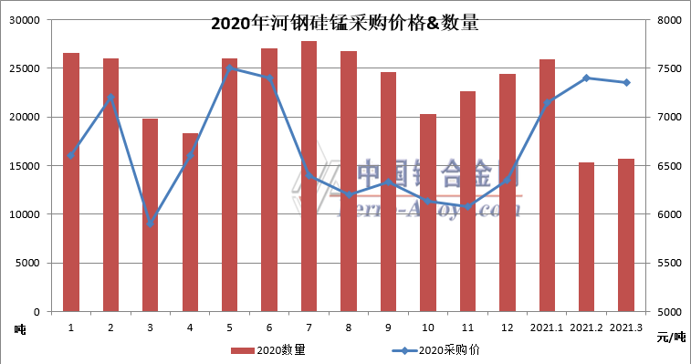 华北某大型钢铁集团3月硅锰合金招标价敲定,为7350元/吨(2月定价为7400元/吨),采量:15730吨,环比2月增加400吨。(2020年3月采量:17280吨)