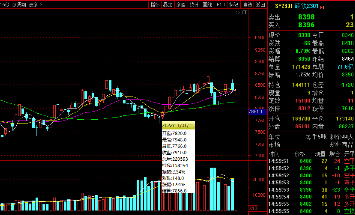 【期货盘面】11月硅铁期货盘面震荡盘整,总体上行,2301主力合约开盘价7,820,最高价8,690,最低价7,766,收盘价8,398,结算价8,350,成交量4,482,730,持仓量144,111,涨幅8.19%。