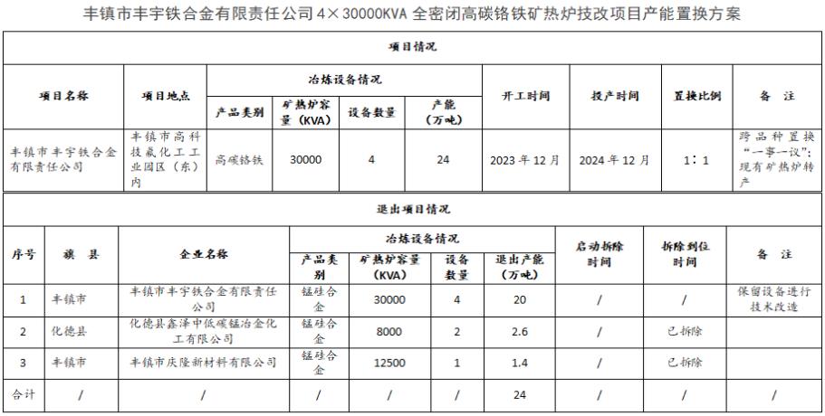 中国铁合金网:按照内蒙古自治区工信厅 发改委 生态环境厅 能源局关于印发《内蒙古自治区促进铁合金产业高质量发展政策措施》的通知(内工信发〔2023〕134号)、内蒙古自治区发展改革委 工信厅 能源局关于修订《确保完成“十四五”能耗双控目标任务若干保障措施》的通知(内发改环资字〔2023〕1081号)、内蒙古自治区发展改革委 生态环境厅 工信厅 能源局关于印发《内蒙古自治区坚决遏制“两高一低”项目盲目发展管控目录(2023年修订版)》的通知(内发改环资字〔2023〕1080号)、乌兰察布市工信局关于印发《乌兰察布市铁合金行业产能置换实施方案(试行)的通知》(乌工信发〔2022〕59号)和关于修订《乌兰察布市铁合金行业产能置换实施方案(试行)》部分内容的通知(乌工信发〔2023〕220号)的相关要求,乌兰察布市工业和信息化局将丰镇市丰宇铁合金有限责任公司全密闭高碳铬铁矿热炉技改项目产能置换方案进行了公示,公示期间无异议,现予公告。欢迎社会公众进行监督。