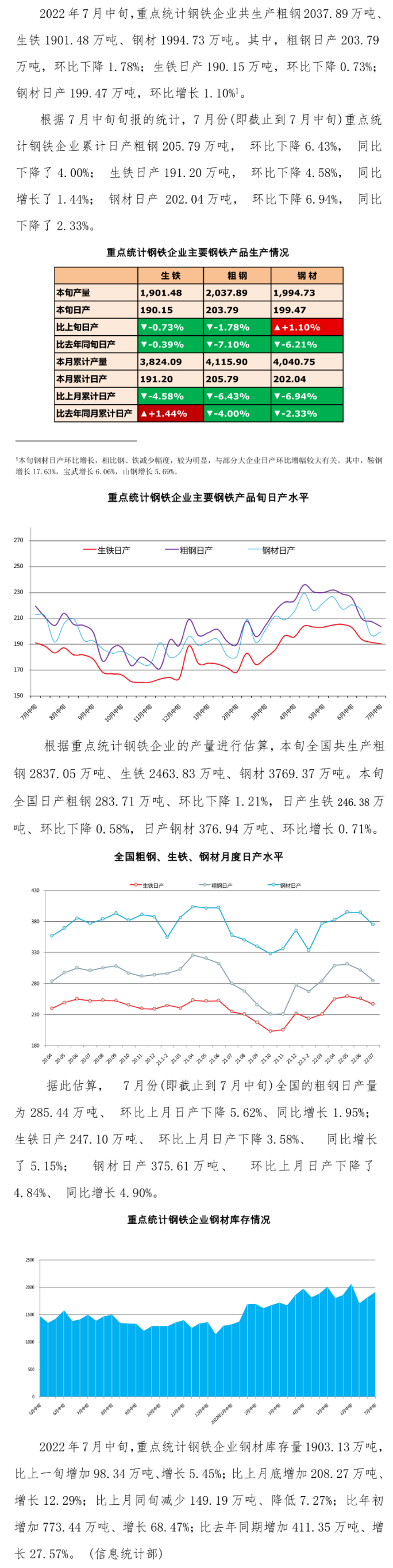 2022年7月下旬,重点统计钢铁企业共生产粗钢2079.20万吨、生铁1930.19万吨、钢材2076.81万吨 |