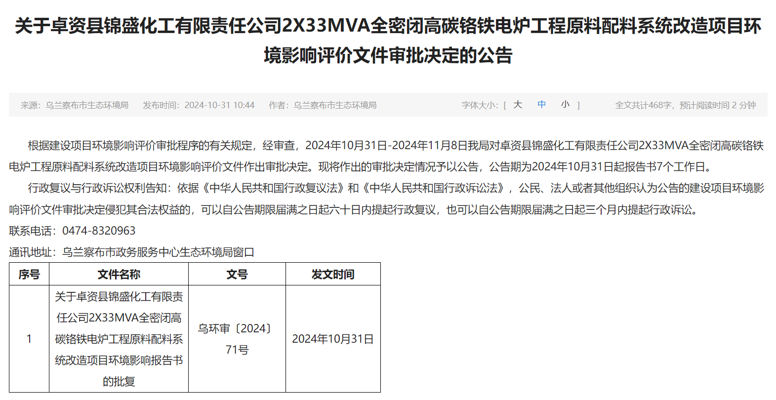 关于卓资县锦盛化工有限责任公司2X33MVA全密闭高碳铬铁电炉工程原料配料系统改造项目环境影响评价文件审批决定的公告