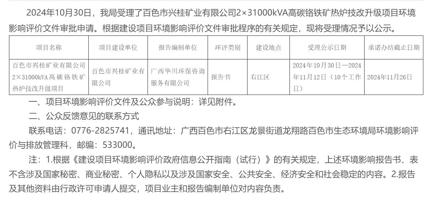 百色市生态环境局2024年10月30日一般建设项目环境影响评价文件审批受理情况公示 |