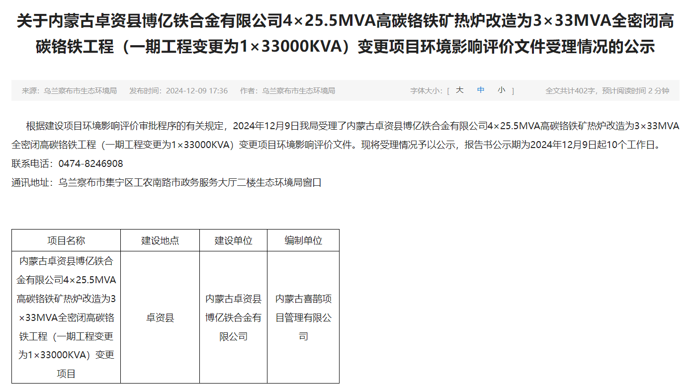 关于内蒙古卓资县博亿铁合金有限公司4×25.5MVA高碳铬铁矿热炉改造为3×33MVA全密闭高碳铬铁工程(一期工程变更为1×33000KVA)变更项目环境影响评价文件受理情况的公示