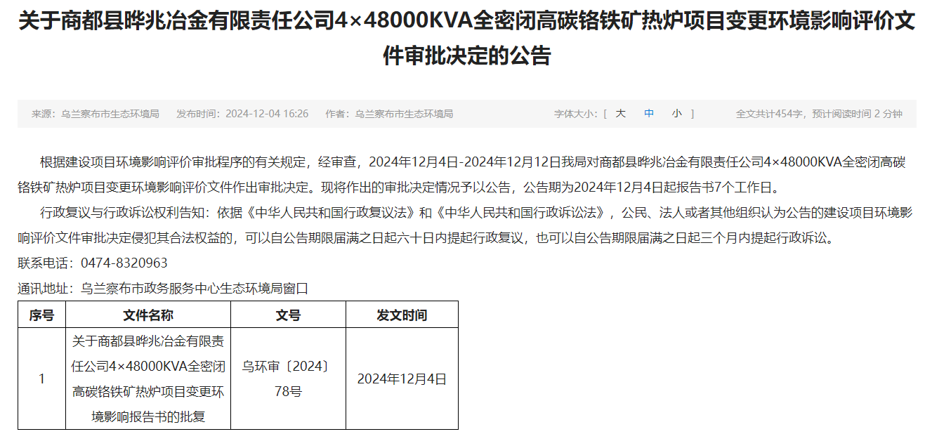 2024年12月4日,乌兰察布市生态环境局就商都县晔兆冶金有限责任公司4×48000KVA全密闭高碳铬铁矿热炉项目变更环境影响评价文件作出审批决定并对外进行公告,公告期为2024年12月4日起报告书7个工作日。 |