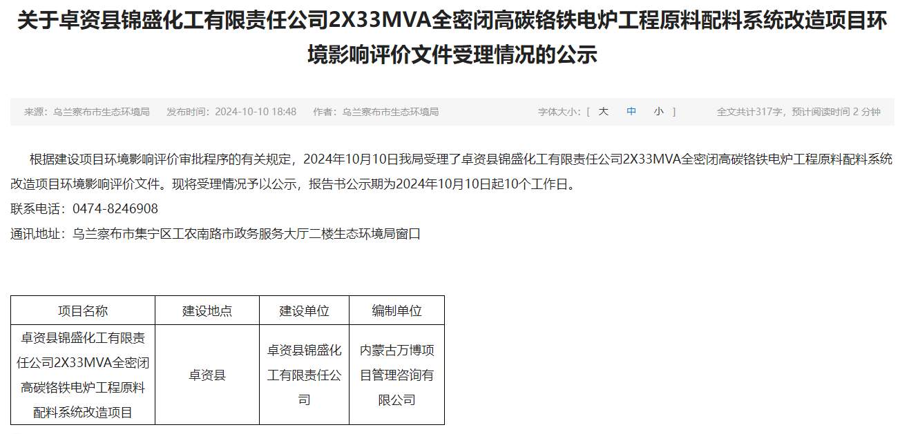 卓资县锦盛化工有限责任公司2X33MVA全密闭高碳铬铁电炉工程原料配料系统改造项目环评获受理