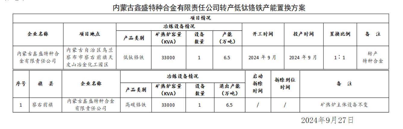 关于化德县蒙誉铁合金有限公司1×30000KVA全密闭矿热炉转产低钛铬铁项目产能置换方案的公示