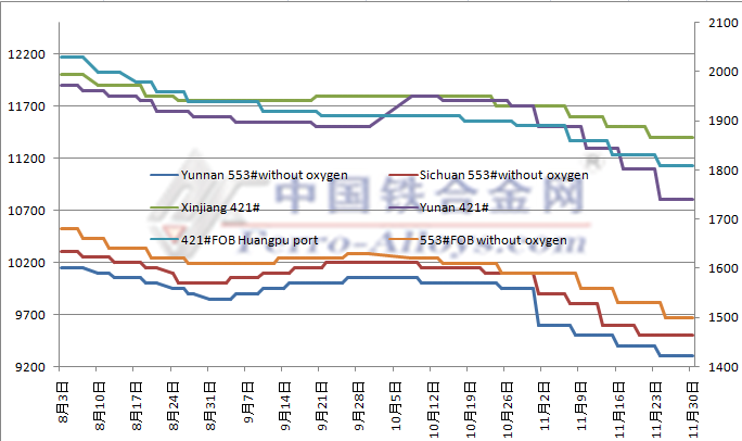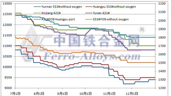 中国铁合金网讯:12月份云南、四川、湖南、贵州地区基本处于停产状态,而福建地区执行完月底电价部分厂家也会选择停炉,而目前在产企业在执行长期订单为主,但是目前市场现货在减少。北方地区内蒙,新疆地区依靠常年电价优势,目前开工正常,而近期又有报道内蒙地区电价即将下调,... |