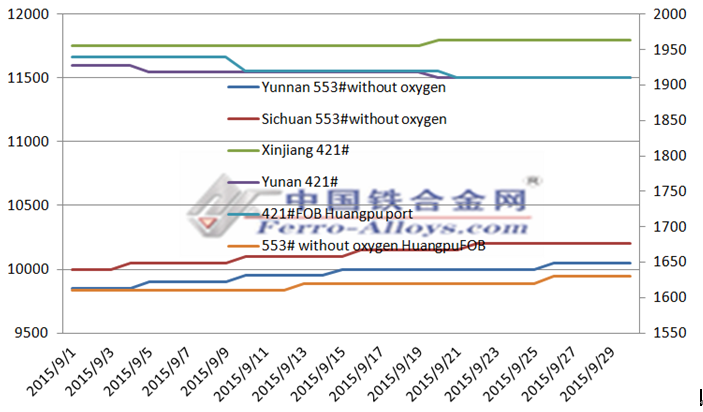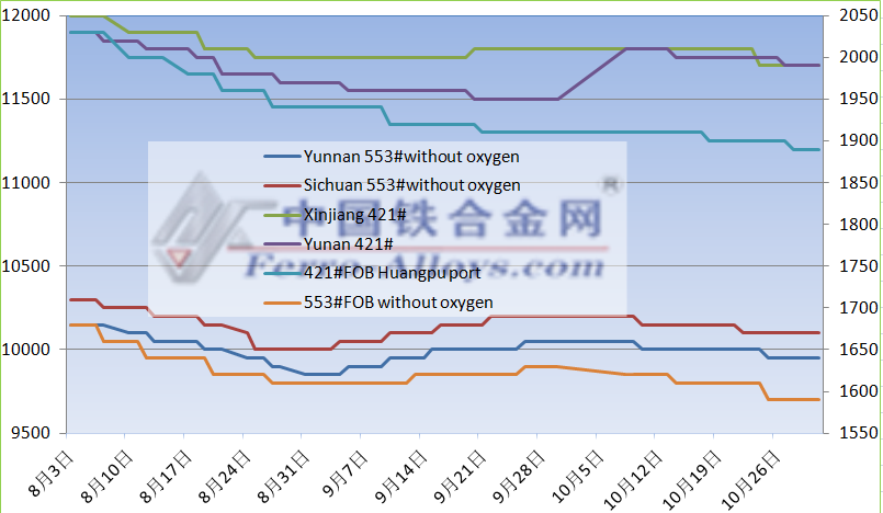 中国铁合金网讯:在“金九银十”之际,十月份金属硅在下旬价格走跌,冶金级、化学级金属硅价格均下跌近100元/吨左右,金属硅整体市场表现弱势运行,厂家维持老客户居多,整体成交不理想。本站分析以下原因: |