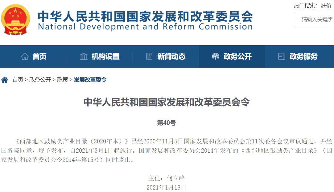 发改委发布《西部地区鼓励类产业目录(2020年本)》
